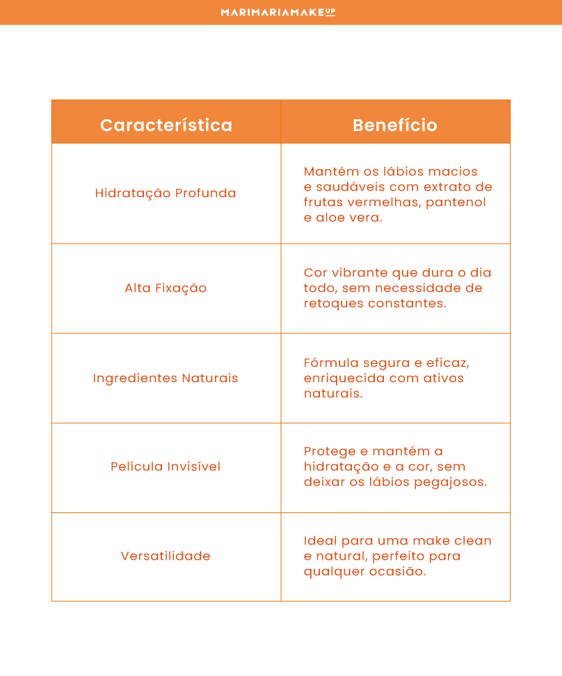 Hidratação Profunda: Com extrato de frutas vermelhas, pantenol e aloe vera, o Acqua Tint proporciona uma hidratação intensa, mantendo seus lábios macios e saudáveis. Alta Fixação: Sua fórmula de longa duração garante que a cor permaneça vibrante ao longo do dia, sem necessidade de retoques constantes. Ingredientes Naturais: Enriquecido com ativos naturais, o Acqua Tint é uma escolha segura e eficaz para quem busca beleza e cuidado. Versatilidade: Ideal para criar uma make clean e natural, perfeito para qualquer ocasião. Película Invisível: Forma uma camada protetora que mantém a hidratação e a cor, sem deixar os lábios pegajosos.